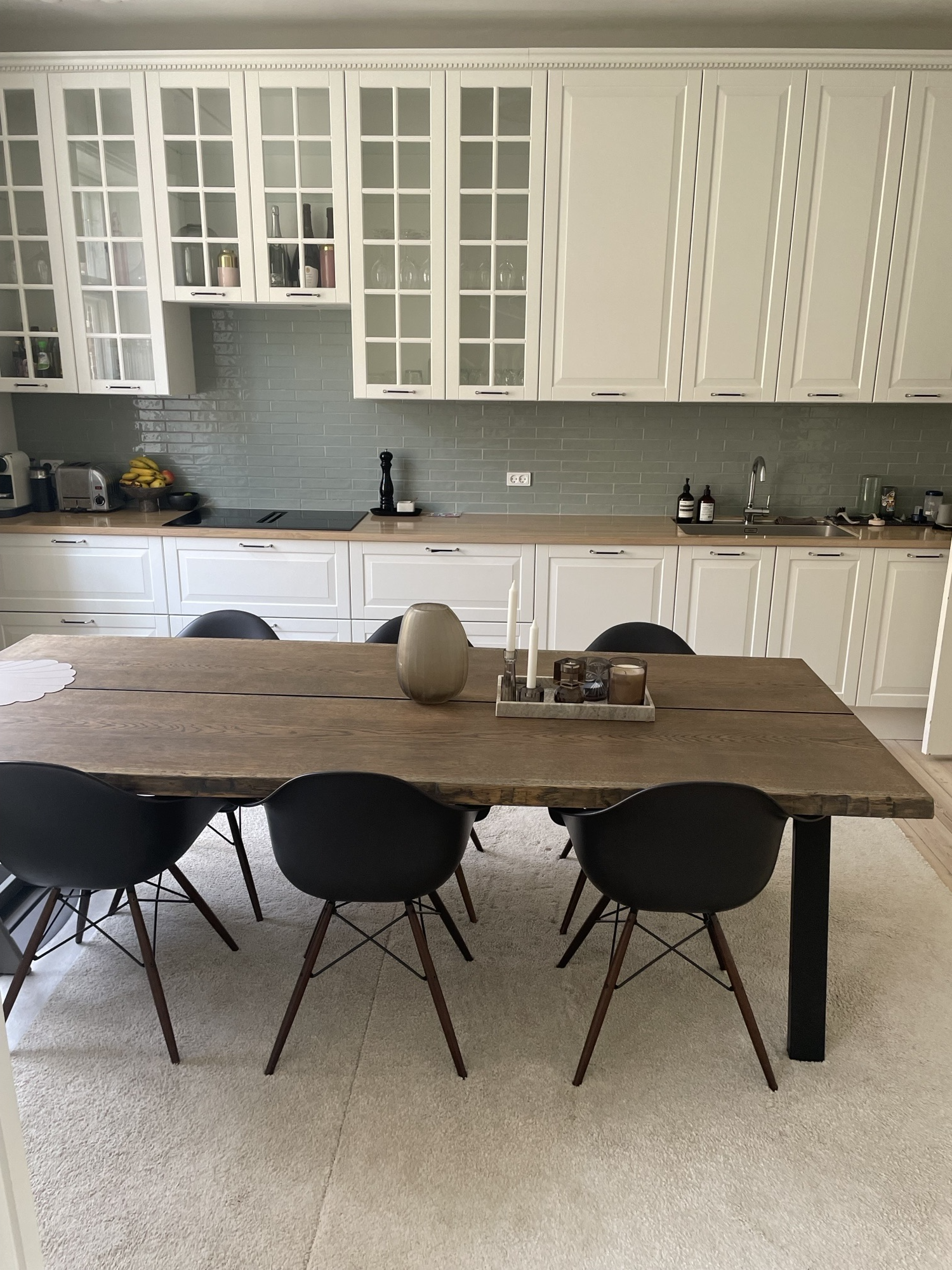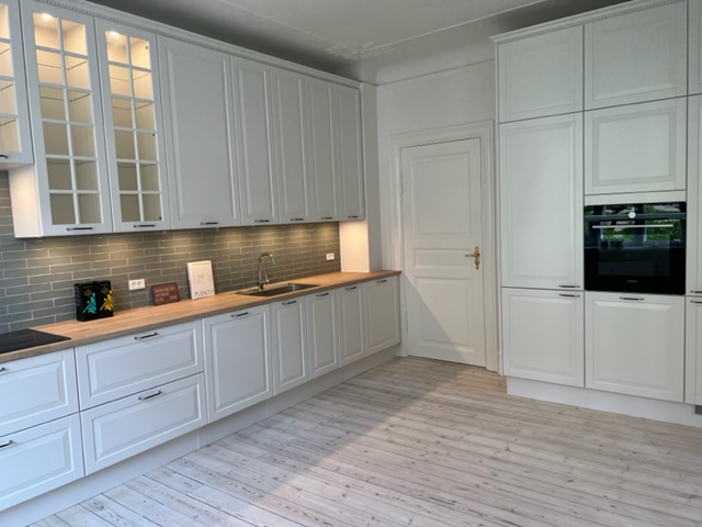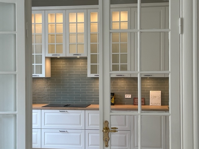 The generous living room impresses with its beautiful bay window, allowing light to flood the space, and through French doors you enter a delightful kitchen–dining room. The kitchen is of a newer white design and fully fitted with all appliances. There is ample space for both everyday living and entertaining guests.